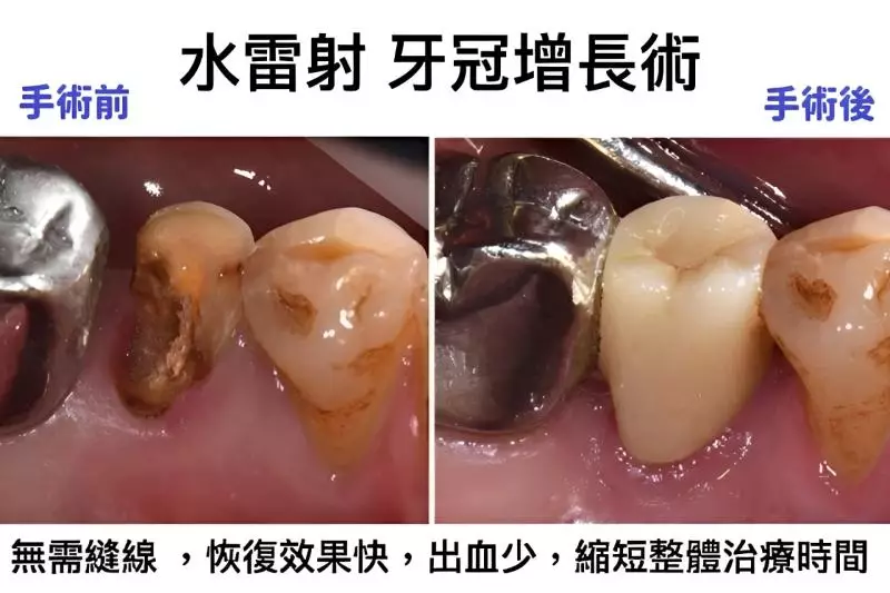 傳統的牙冠增長術傷口較大,7至10日之後才能拆線,大約1.5至3個月會復原。水雷射牙冠增長術,藉由雷射刺激生物組織,幫助傷口快速恢復,並且助於達到降低傷口感染率的效果,大幅減少出血量及傷口大小,恢復期縮短至3至5天。手術時間半小時至一小時,但須按照個別病情而定。